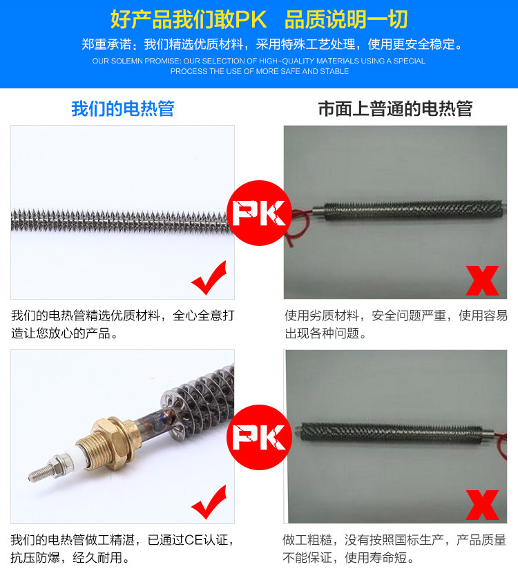 翅片干烧电热管采用优质不锈钢、改性氧化镁粉、高电阻电热合金丝、不锈钢散热片等材料,通过先进的生产设备和工艺制作而成,并进行了严格的质量管理,翅片散加热管可以安装在吹风管道中或其它静止、流动空气的加热场合。